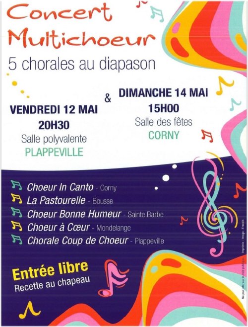 Notre chorale de Coeur et santé de Mondelange participe aux concerts qui ont lieu à Corny et Plappeville. Voir affiche ci-dessous.